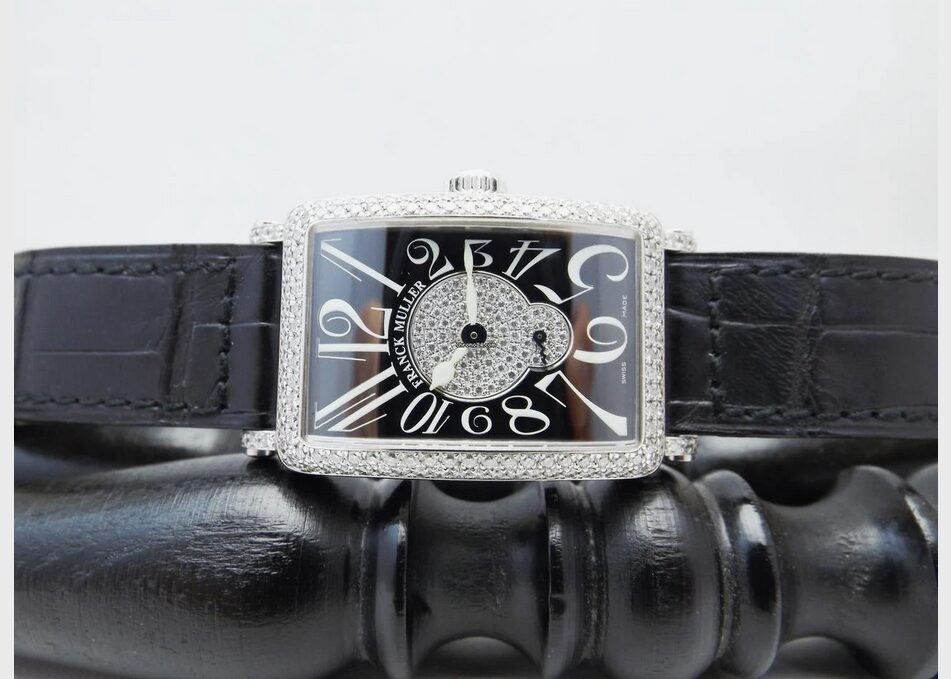 Orologio marca Franck MUller modello Long Island ref. 900 S6 D2P in oro bianco -cassa rifinita in diamanti factory – quadrante nero rifinito in diamanti factory – fibbia rifinita in diamanti factory. Movimento a carica manuale perfettamente funzionante.