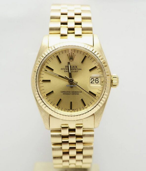 Orologio marca Rolex modello Datejust Mid siaze – 31mm – boy size – quadrante champagne – bracciale jubilee in ottimo stato adatto per polsi da 17,5cm fino a 19,5cm registrabile solo spostando il registro – Ghiera zigrinata in oro giallo – orologio in ottime condizioni, venduto con garanzia di 12 mesi e box aftermarket Rolex in omaggio.