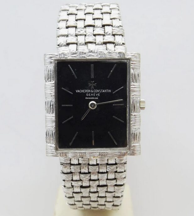 Orologio marca Vacheron Constantin referenza 7981 interamente in oro bianco 18kt 750, movimento a carica manuale cal. 1003 revisionato e funzionante, cassa da 25mm per 27mm, quadrante nero, vetro minerale, bracciale a maglia intrecciato con chiusura a scatoletta e doppia sicura, misura adatta per polsi fino a 18,5cm circa di circonferenza.